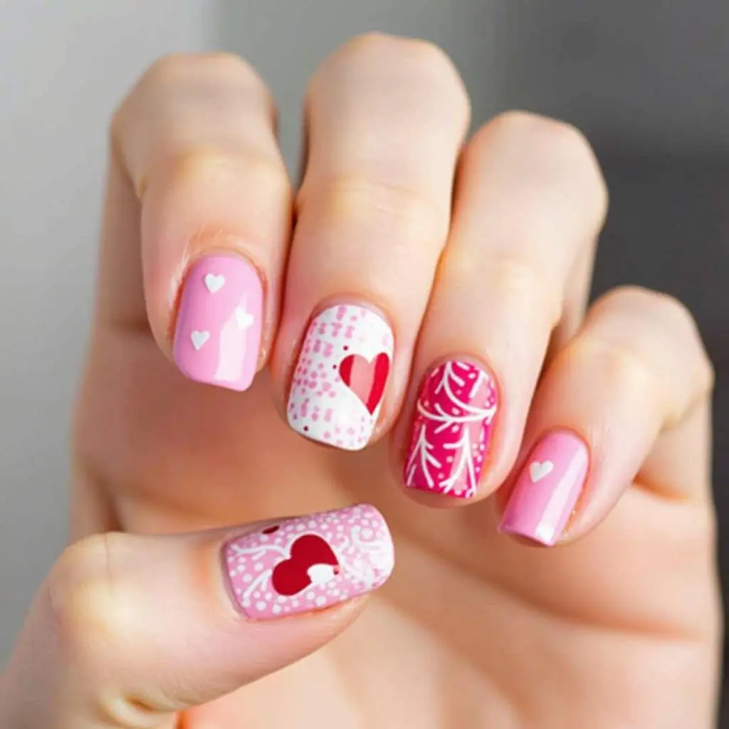 For a softer design, use pastel pink and white for heart-shaped candy canes, giving your nails a delicate, candy-inspired vibe.