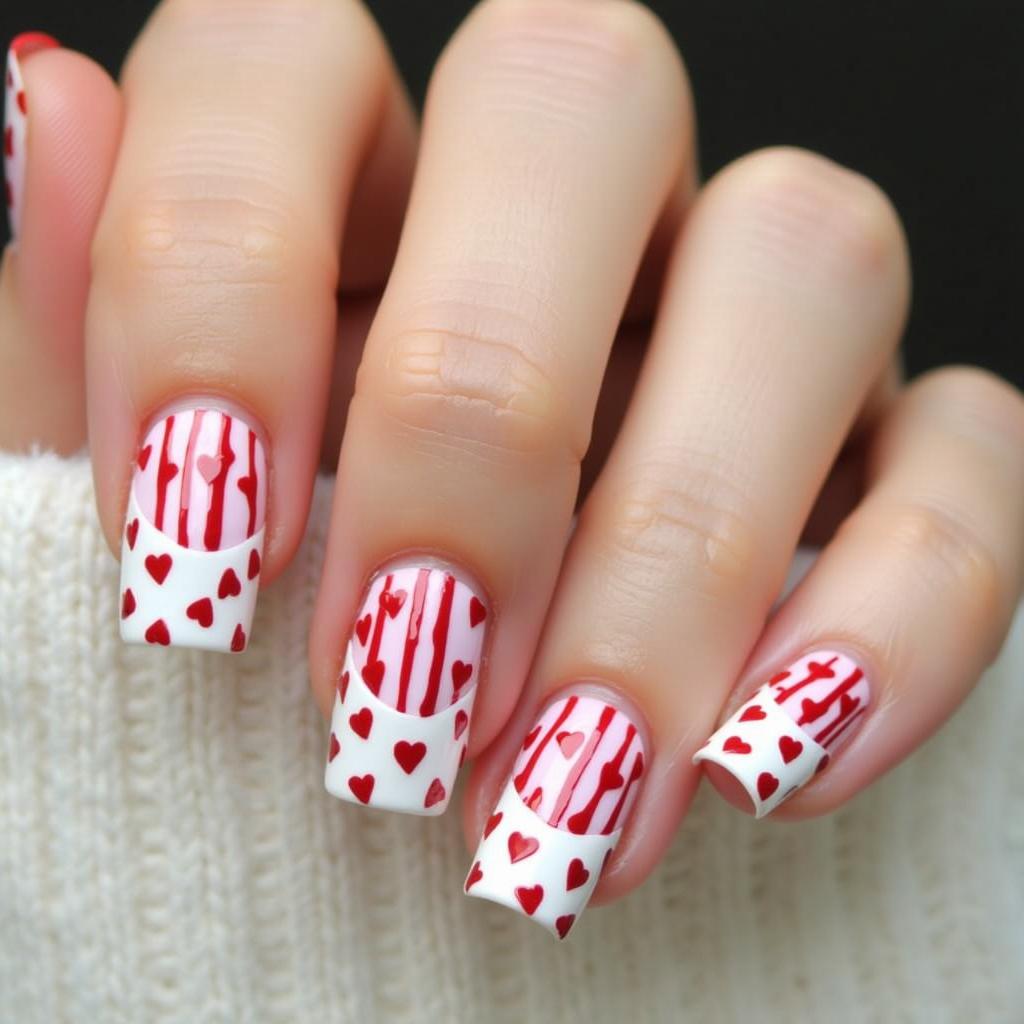 Paint heart-shaped candy canes with red and white stripes on your nails for a festive look.