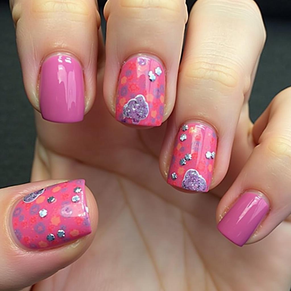 Choose a few accent nails to paint with gummy bears, while the rest of your nails are a solid pink or red.