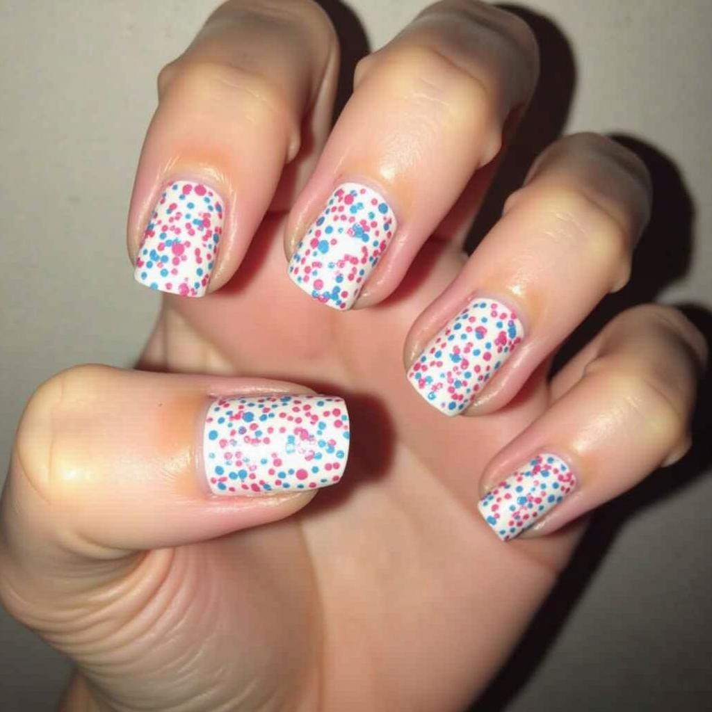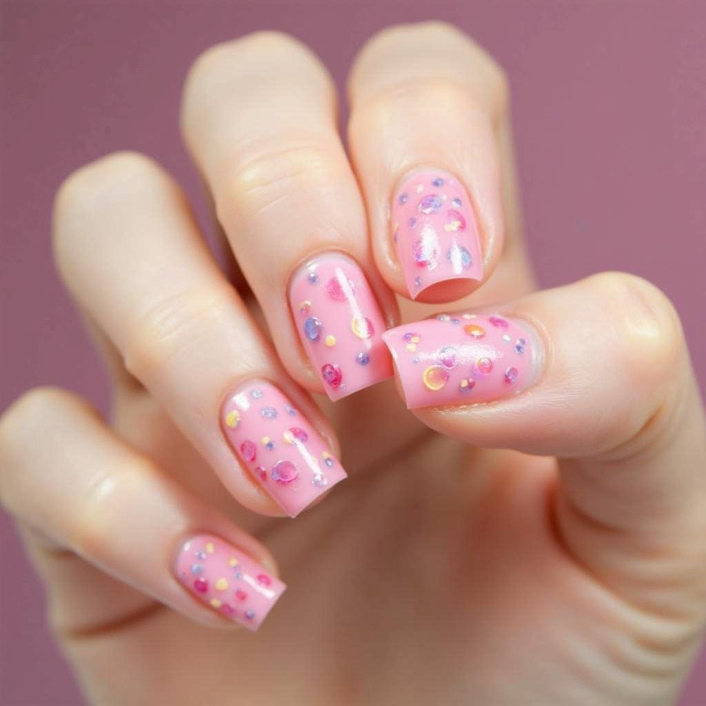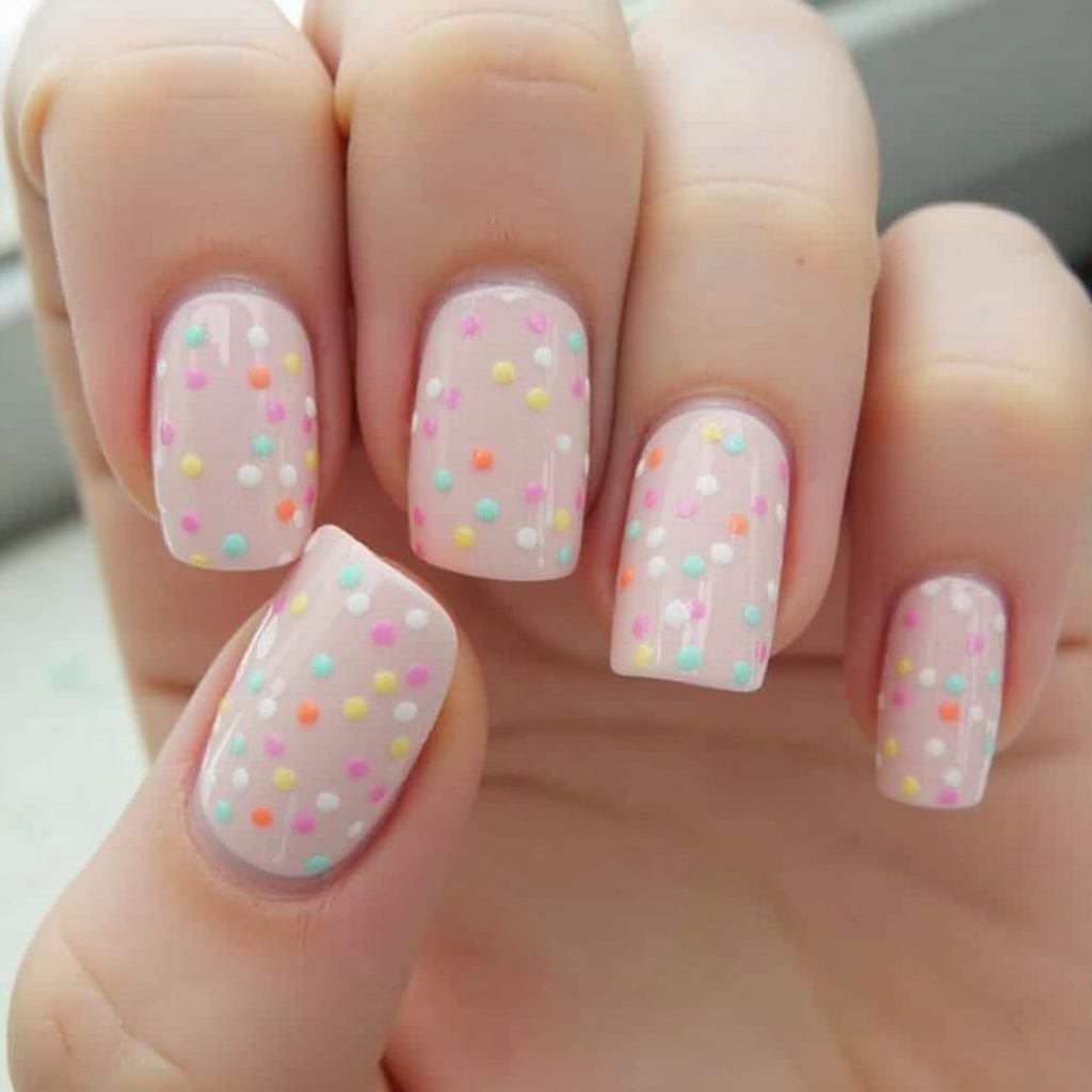 Paint rainbow-colored sprinkles across a pastel pink or white base for a playful, candy-inspired look.